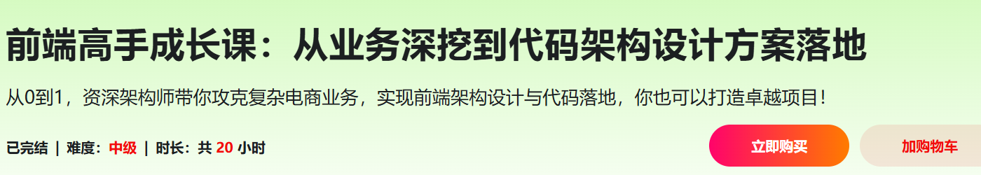 课程介绍:前端代码架构设计能力强弱,是前端职业发展的分水岭。如果你拥有强大的代码架构设计能力,你可以轻松应对复杂的业务需求,而如果你不提升代码架构设计能力,很可能因一次小变更而导致程序崩溃。面对前端业务需求变化频繁和职业发展的挑战,如何更好的破局?这也是本课程的主旨重点。 这门课程会从真实的前端电商业务场景出发,带你从需求梳理到架构落地,并通过电商核心模块的全流程开发实践,组件封装及代码架构设计,最终教会你打造出高可靠性和强可维护性的项目。如果你也想突破困局,欢迎你加入这门课。从此,像架构师一样思考,开启你的卓越开发与财富创造之路!