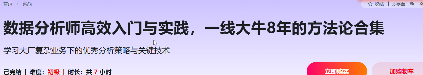 互联网时代数据无处不在,市面教程却鲜少触及数据思维的本质。慕课网特邀一线数据分析师,曾任职腾讯、美团、快手,凭借八年一线经验,辅以大厂真实案例,挖掘数据背后的逻辑与思维真相,旨在让同学听得懂、学得会、用得上,利用数据思维精准决策职场、生活中的复杂问题。课程不仅适用于专业人士,也适用于各行各业的人士,并且由老师定制最新版分析师职业发展路径,助力提升入行、转行收获优质offer的概率。