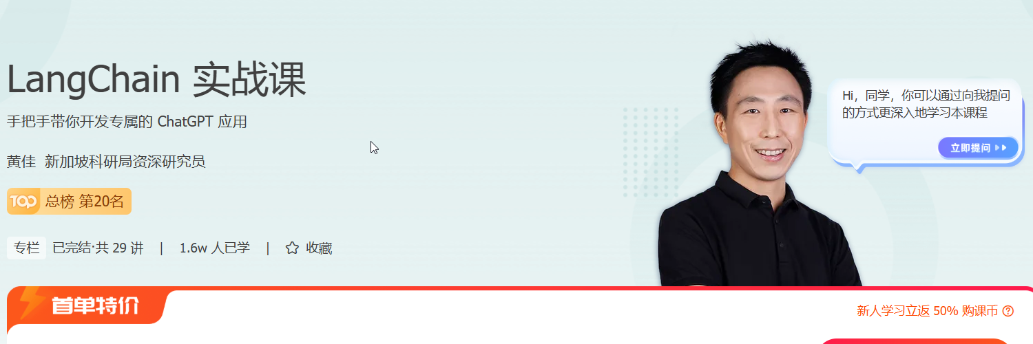 在 AI 应用开发的浪潮下,我们诚邀黄佳老师开设了这门课程,共同探索如何使用 LangChain,并将 LangChain 各个组件的原理嵌入一个完整的业务场景进行讲解,带你跨越从原理到实际应用的最后一公里!