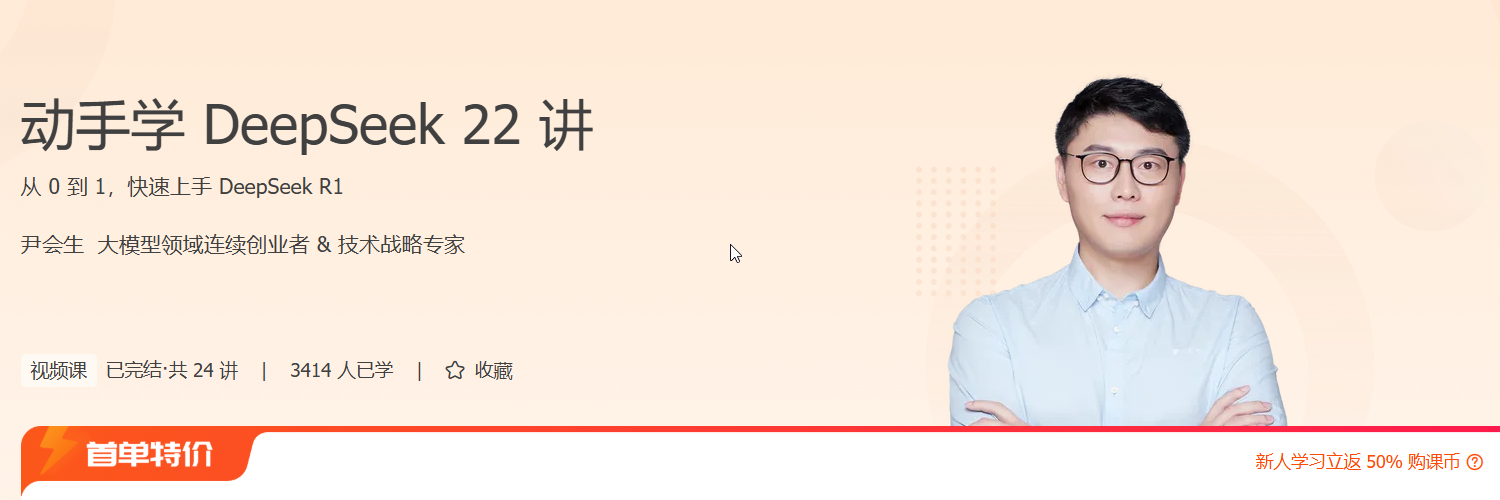 在 AI 驱动后端架构升级的浪潮中,掌握大模型开发与部署能力已成为技术突围的关键。本课程《动手学 DeepSeek 22 讲》由 AI 专家尹会生主讲,带你从零构建完整的 DeepSeek R1 应用能力体系,直击后端智能化核心场景。