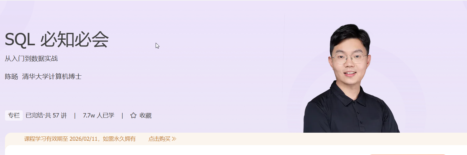 在后端开发与系统架构中,数据库是支撑业务稳定运行的核心组件,而 SQL 作为与数据库交互的关键语言,其重要性不言而喻。《SQL 必知必会》课程由清华大学博士陈旸主讲,系统覆盖 SQL 从语法基础到实战应用的完整知识体系,帮助你构建扎实的数据处理能力。课程内容分为基础、进阶、高级与实战四大模块,结合 NBA、王者荣耀、银行、新能源车等真实案例,深入讲解 DDL、DML、查询优化、索引设计、事务机制、性能调优等关键技术。通过本课程,你将掌握主流数据库管理系统(如 MySQL、Redis、SQLite)的使用与优化策略,具备在高并发、大数据场景下进行数据建模与架构设计的能力,为后端开发、系统架构、数据平台建设等职业方向打下坚实基础,助力你在技术成长之路上走得更稳、更远。