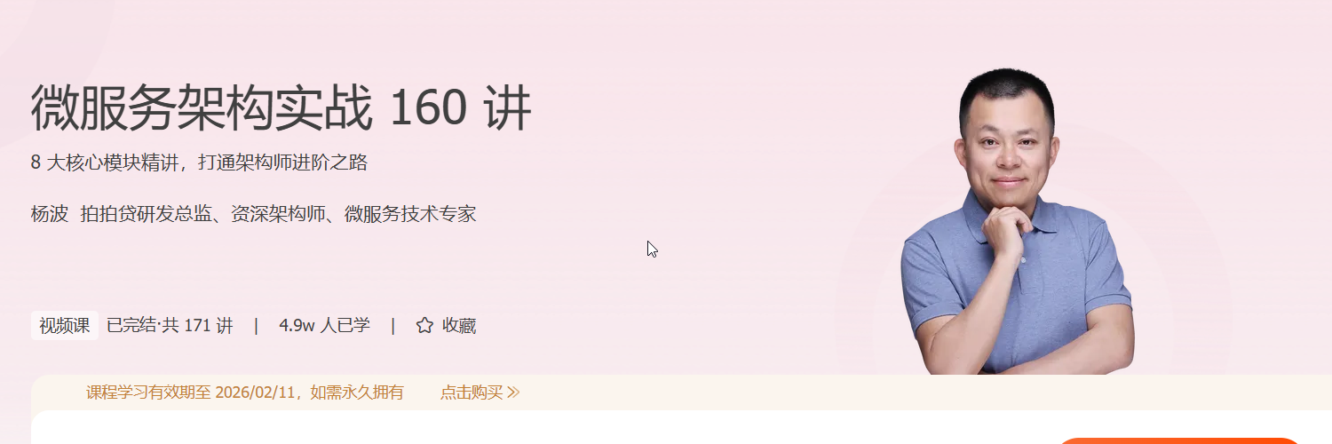 本课程基于讲师多年在一线企业的架构建设实践经验,通过原理讲解与实践操作的方式,帮助你学会从 0 到 1 深入理解主流微服务技术栈组件及架构,掌握根据企业场景设计和搭建微服务架构的核心技能,踏上从程序员到架构师的进阶之路。