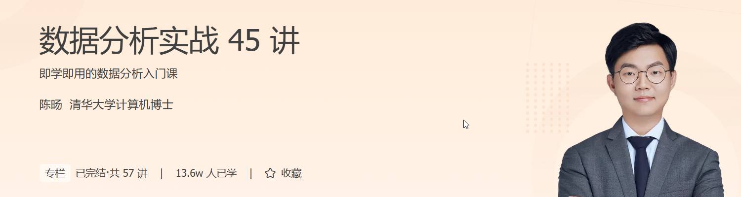 在这个专栏里,他将结合自己的学习体会和实践经验,带你由浅入深掌握数据分析的核心知识点,并且结合案例手把手教你从源头上认识数据分析,熟悉对应的工具操作。同时,为了帮助你融会贯通,专栏还设计了专属题库,保证你能够即学即用。