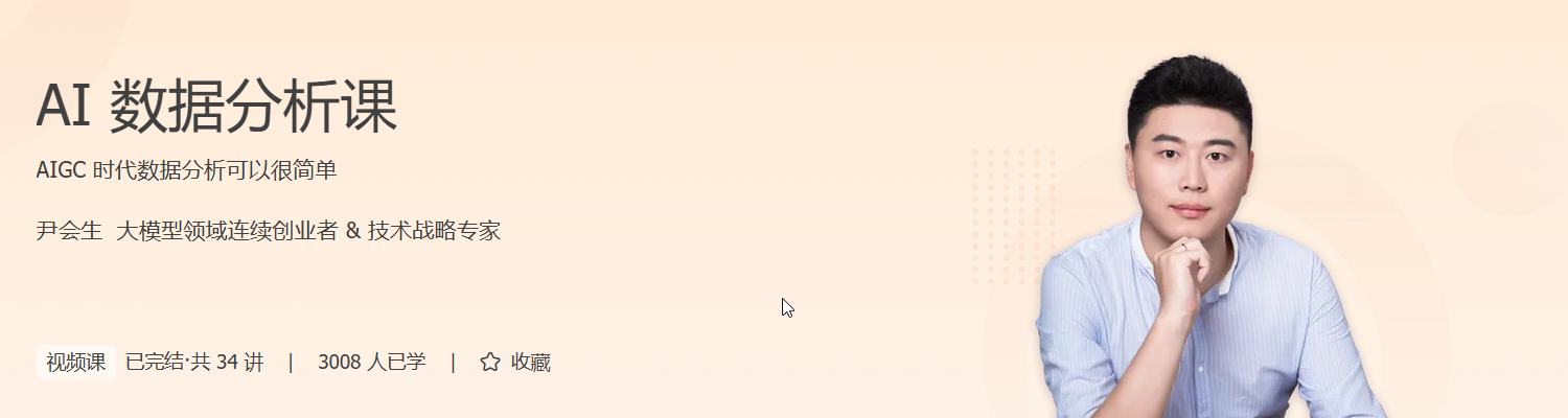 在 AI 技术迅猛发展的今天,掌握数据分析技能已成为职场竞争力的关键。《AI 数据分析课》由大模型专家尹会生主讲,带你零门槛迈入数据分析世界,快速掌握大模型时代的核心能力。课程覆盖数据清洗、可视化、预测优化、隐私保护等八大模块,结合 ChatGPT、Coze、OpenAI 工具等实战平台,帮助你在真实项目中游刃有余。你将学会自动化爬虫、交互式分析、构建知识库,甚至用 AI 生成图表、辅助决策。无论是运营、财务、销售还是学生,都能通过这套技能提升效率、优化策略,为职业发展打开新通道。学完即可应用于实际工作,成为懂数据、会分析、能决策的复合型人才。