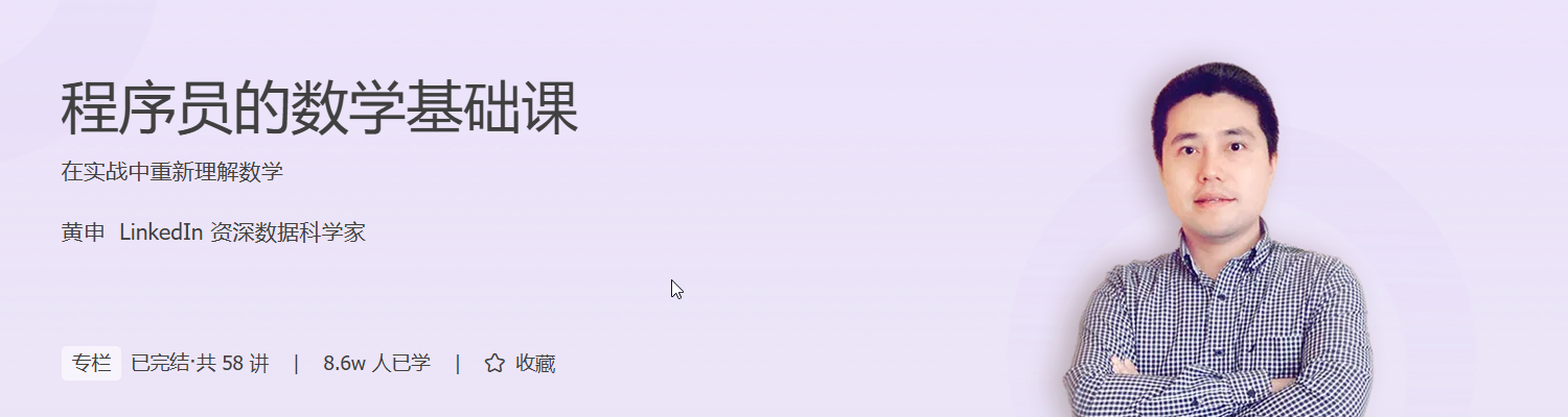 在人工智能飞速发展的今天,数学已成为驱动算法创新的核心引擎。本课程《程序员的数学基础课》由 LinkedIn 资深数据科学家黄申主讲,系统梳理程序员必备的数学知识体系,帮助你在人工智能、机器学习、数据科学等领域打下坚实基础。课程涵盖二进制、递归、动态规划、概率统计、线性代数等关键模块,结合哈希函数、推荐系统、搜索引擎、文本分类等真实应用场景,将抽象数学转化为可落地的编程实践。你将掌握 PCA 降维、SVD 推荐、贝叶斯分类、图搜索等核心技能,提升算法设计与模型优化能力。无论是备战 AI 岗位、转战数据科学,还是夯实编程内功,这门课都将助你打通数学与技术的任督二脉,实现职业能力的跃迁升级。