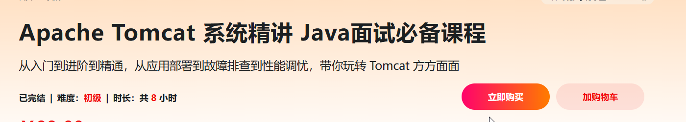 Tomcat是互联网大厂必备技术栈,更是面试必考技能点。但是,很多开发者往往只熟悉于自身业务开发,当遇到Tomcat系统配置、故障排查、性能瓶颈等问题时,无法高效解决生产中突发问题,错失晋级跳槽时机。课程带你深入理解Tomcat 核心组件、线程模型、高可用集群、监控、性能调优等;更会结合源码分析Tomcat命令对系统层调用,深挖原理,构建专业的Tomcat技能体系,轻松应对面试官各种刁难,倍增生产实践经验。