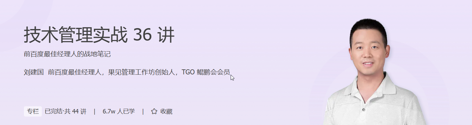 你是否正从技术走向管理,或希望在产品与增长领域提升领导力?这门《技术管理实战 36 讲》正是为你量身打造。课程由前百度最佳经理人刘建国主讲,系统覆盖角色认知、团队建设、任务执行、管理沟通等核心模块,帮助技术人完成向管理者的跃迁。你将掌握“管理三明治”模型、“沟通四维法”、“团队战斗力六要素”等实战工具,应对多任务并行、向上沟通、梯队培养等真实挑战。学完即可提升团队效能、打造高凝聚力组织,并在产品迭代与业务增长中发挥更大影响力。无论你是想带好团队、推动项目落地,还是迈向更高阶的管理岗位,这门课都将为你注入强劲动能,让你在技术与管理双轨并行中走得更稳、更远。
