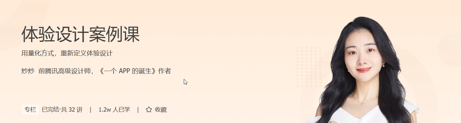 因此,我们特意邀请了炒炒老师,她会从实际问题出发,带你一步步深入学习体验设计,如何入门?如何精进?她都会告诉你,并且给你梳理出一整套从基础到进阶的体验设计方法论。