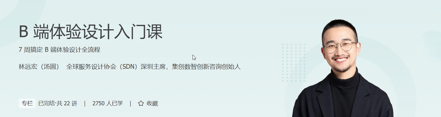 基于此,我们邀请到了集创数智创始人、全球服务设计协会 SDN 深圳主席林远宏(汤圆)老师,为你讲解 B 端体验设计的核心方法,带你快速掌握分析 B 端需求以及设计 B 端产品构架、业务流程、界面、组件等方法,提升在公司内部的价值感和话语权。
