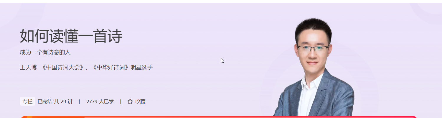 所以,这次我们请到了自小酷爱诗词,对诗词有着超乎常人的敏锐感悟能力的王天博老师。读诗词对他来说,就像刷短视频一样简单快乐。我们希望借着王老师读诗的方法,带你体会诗词的美,教你像刷短视频一样轻松读诗词,让你在诗词中获得审美的能力和生命的力量,以此来完善自己。