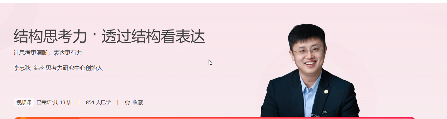 为了解决这些问题,让你掌握快速组织思维的方法,在日常表达中保障效率和效果,极客时间推出了这门精选合作课程,来自「结构思考力研究中心」。李忠秋老师将通过结构化的方法,帮助你建立在表达之前深度思考的习惯,从而让你在文字表达时不依赖套路模版也能使观点明确、结构严密,做到持续吸引受众!